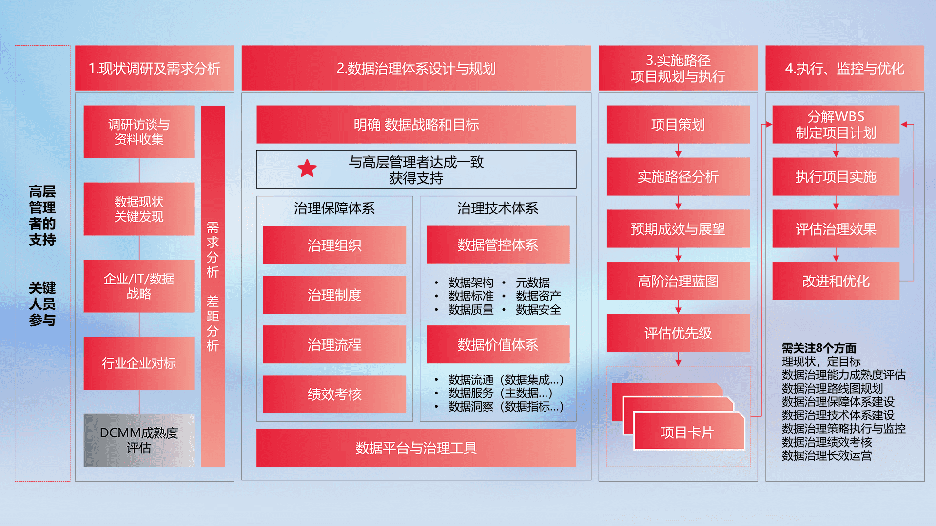 制定并执行统一的数据标准,,,,规范数据定义和格式,,,,消除冗余和不一致性,,,实现跨部门和跨系统的数据一致性,,为企业提供标准化的数据基础。。