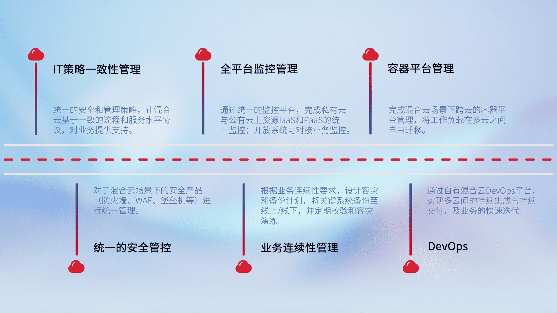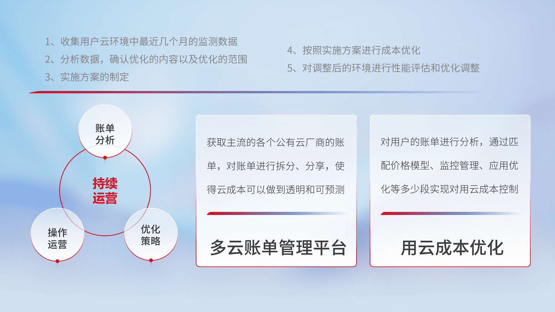 通过多云纳管,,,,以统一的资源数据模型把客户的云资源进行抽象和封装,,,进而实现对多云资源的统一操作,,,保障云资源管理的可靠性、、稳定性与可用性。。。。量身定制化运维内容,,,,配置、、开发运维、、、、补丁管理、、、备份、、监控、、、认证和访问管理、、、、审计和日常巡检等,,,保障在用云过程中的可靠度,,,,稳定度以及高可用率。。。