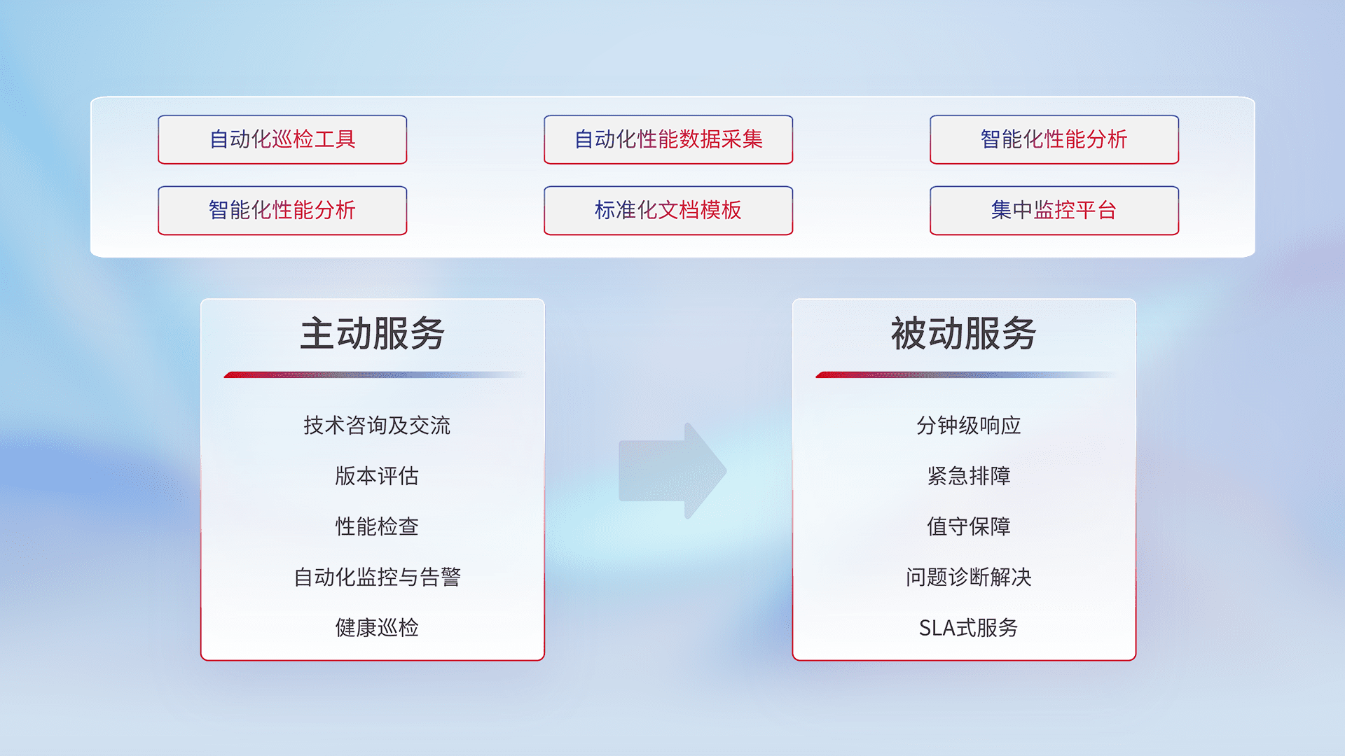 智能化工具和标准化文档,,,保障服务质量,,,提供主动服务(包含技术咨询、、版本评估、、、性能检查、、、、自动化监控与告警、、、健康巡检)和被动服务包含(分钟级响应、、紧急排障、、、、值守保障、、、、问题诊断解决、、、SLA服务)。。。。